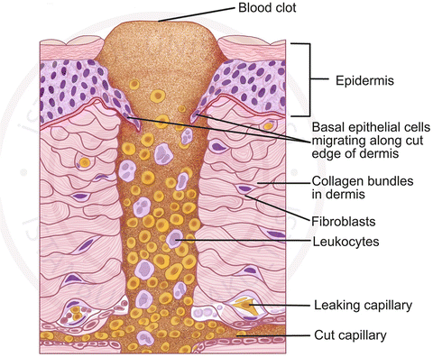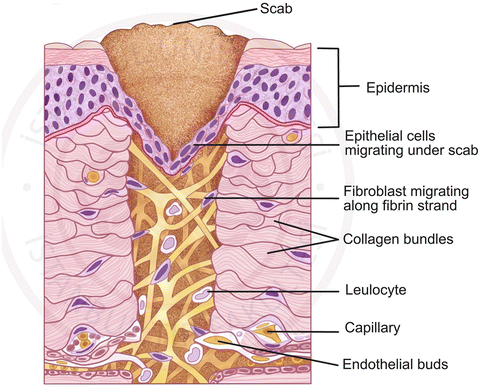 Wounds in which the sub-epithelial tissue is also damaged proliferates across whatever vascularized tissue bed is available & stays under the portion of the superficial blood clot that desiccates (forms a scab) until it reaches another epithelial margin. Once the wound is fully epithelialized, the scab loosens and is dislodged